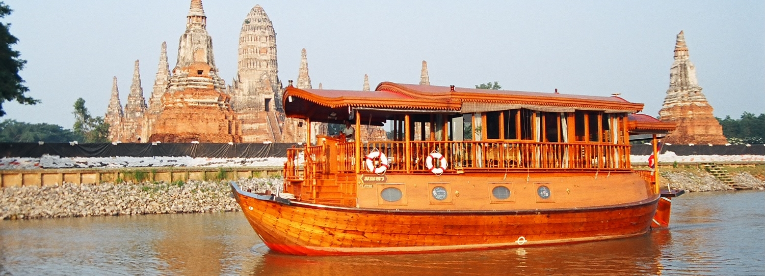 The lounge and dining areas: designed like a garden pavilion with light, ornate, teak balustrade, afford uninterrupted views of the river. The decorative teak ceiling features a traditional ceiling fan to supplement the river breezes, adding to the tropical Old-World atmosphere. Solid teak traditional panelling includes a high relief teak carving depicting a scene from the Ayutthaya period.